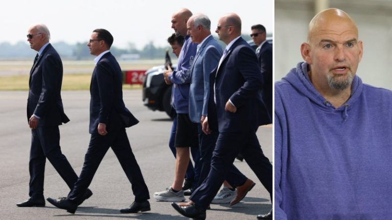 Sen. John Fetterman, D-Pa., donned a hoodie and a pair of shorts with sneakers for a Saturday event with President Biden and Pennsylvania Gov. Josh Shapiro in Philadelphia, where officials discussed Interstate-95 and the reconstruction efforts underway.